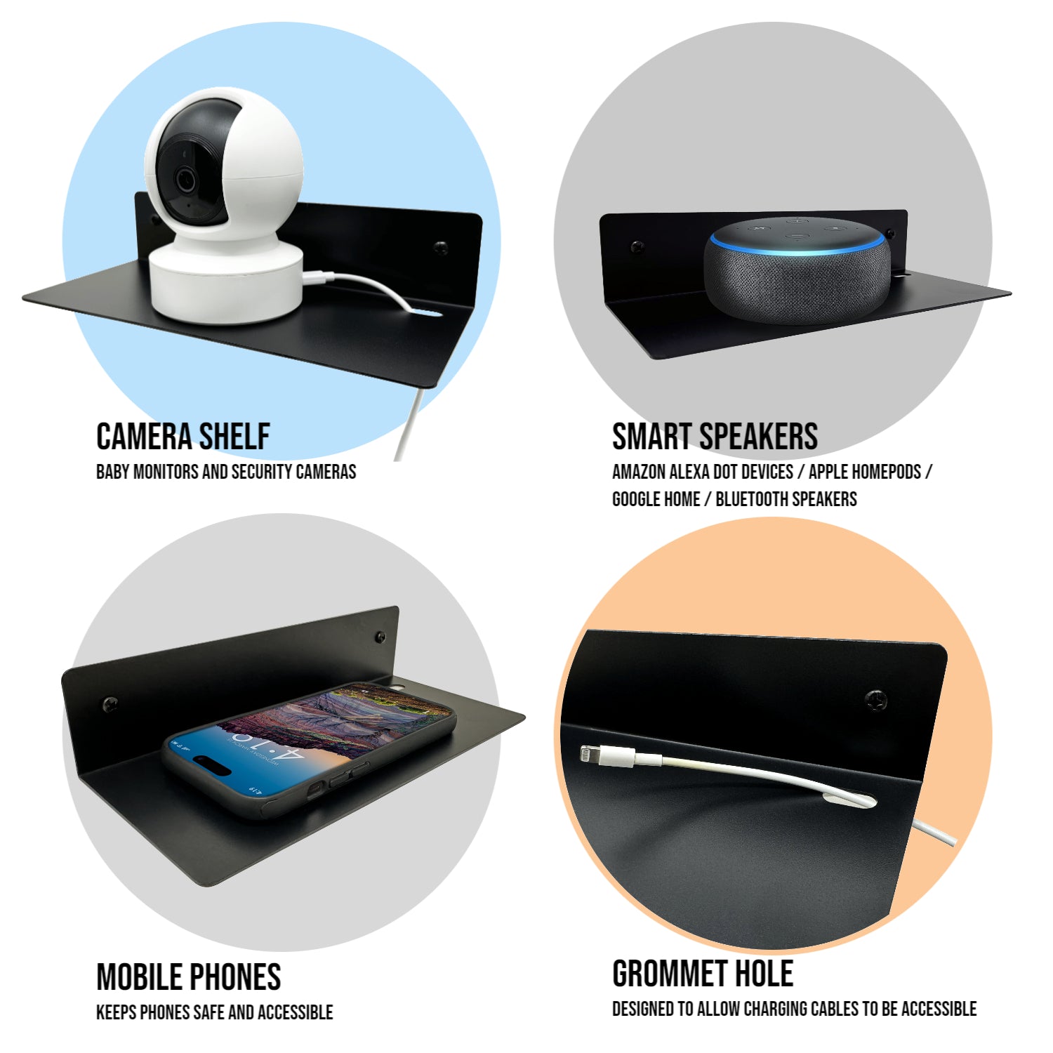 Multi-purpose small floating shelf can go anywhere you need a small platform that easily and quickly mounts to your wall or furniture. Perfect for small speakers, smart home devices, cameras, phones, baby monitor, photos, collectibles, toys, succulent planters, and much more.